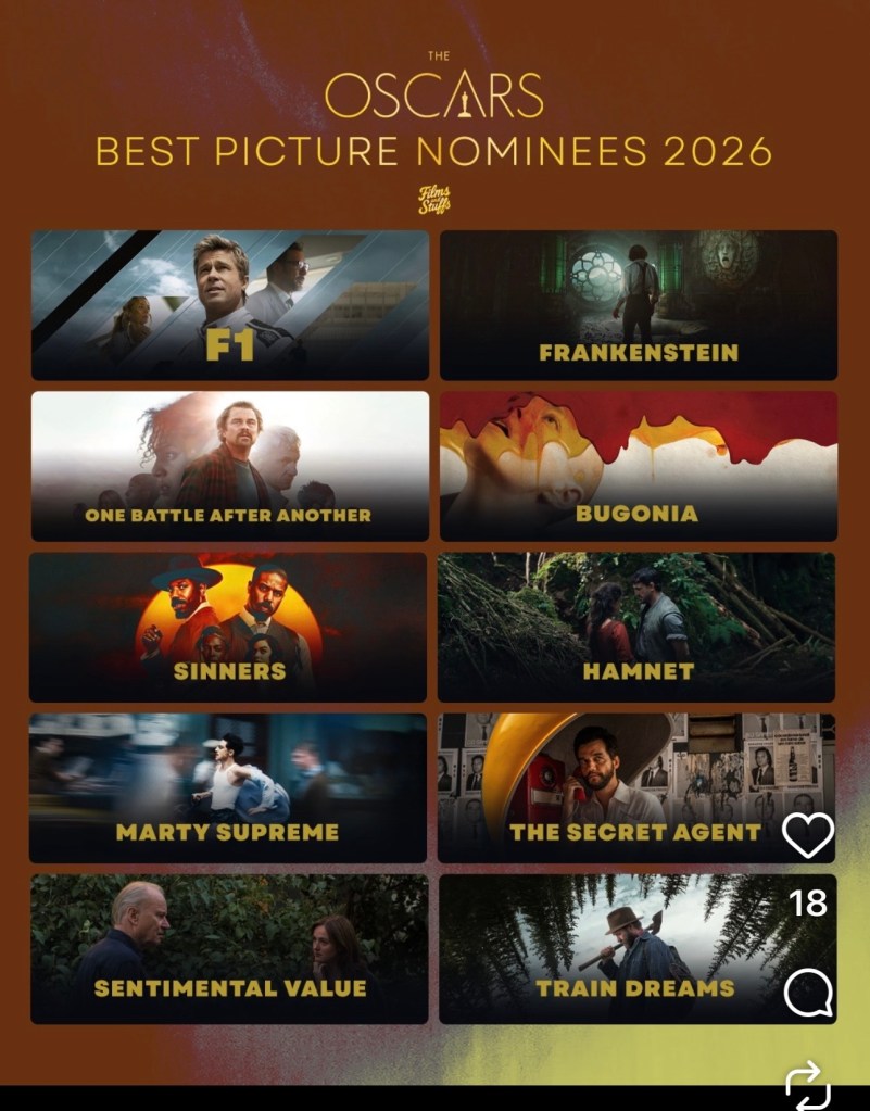 This year’s Oscar nominations for Best Picture run the gamut from visually soulful (Train Dreams) to nail biting nail biting horror (Sinners) to why-was-this-movie-nominated (F1). Here’s a rundown, with a few fun factoids thrown in and predictions for chances of winning the coveted prize.